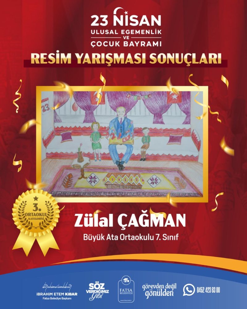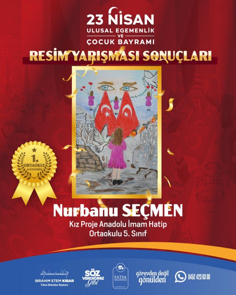 Fatsa Belediyesi tarafından geleneksel hale getirilen ve bu yıl yedincisi düzenlenen “23 Nisan Ulusal Egemenlik ve Çocuk Bayramı” konulu ödüllü resim yarışması sonuçlandı. Büyük ilgi gören yarışmada, öğrencilerin birbirinden renkli ve anlamlı eserleri jüri tarafından değerlendirilerek dereceye giren isimler belirlendi.