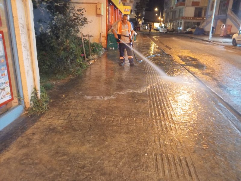 Genel temizlik, konteyner yıkama ve dezenfekte işlemlerinin yanı sıra cadde ve sokakların süpürülüp yıkanması aralıksız sürüyor.