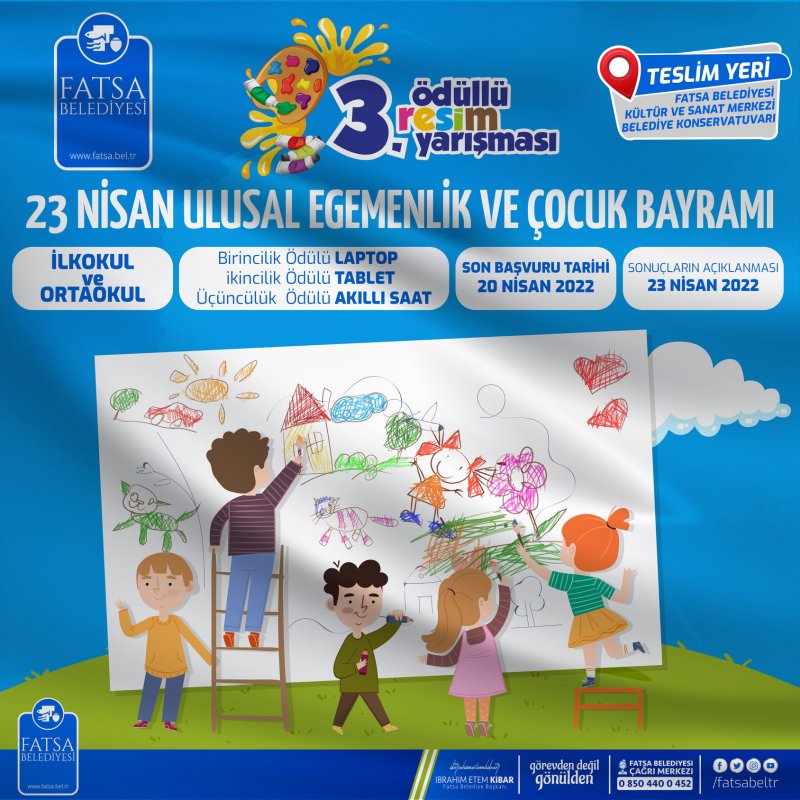“23 Nisan Coşkusunu Resme Sığdır” temalı ödüllü resim yarışmasının bu yıl üçüncüsünü düzenlediklerini ifade eden Fatsa Belediye Başkanı İbrahim Etem Kibar, “Çocuklarımız 23 Nisan coşkusunu resimlere doldurup taşırsın. İlkokul ve Ortaokula giden öğrencilerimiz için düzenlediğimiz ödüllü resim yarışmasına çocuklarımız neşeleriyle ve coşkularıyla bize ortak olsunlar. Biz onlara güzel bir gelecek bırakmak için çalışırken tüm kardeşlerimi, ‘23 Nisan’ Coşkusunu resme sığdır temalı, resim yarışmasına davet ediyorum. Ayrıca 23 Nisan günü çocuklarımıza bir sürprizimiz daha var.” dedi.