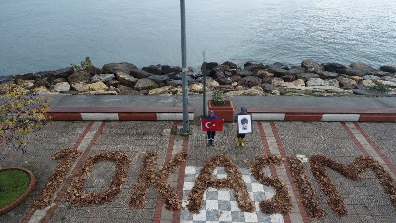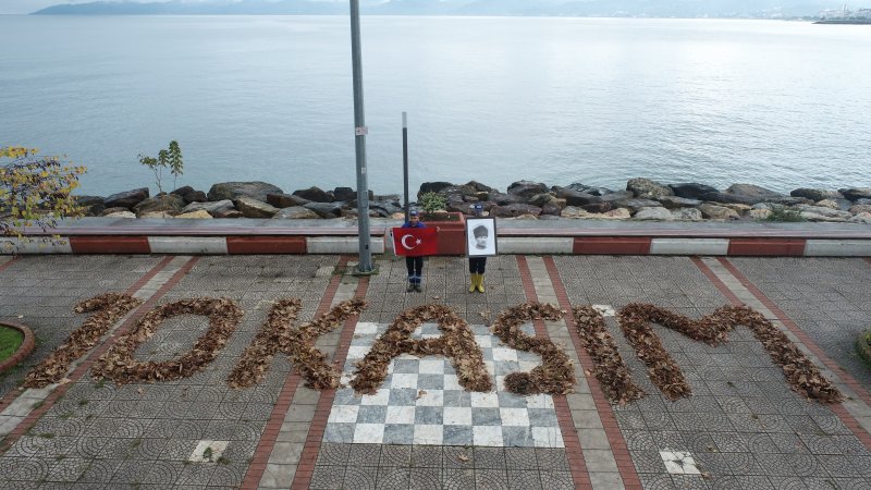 Fatsa Belediyesi Temizlik İşleri Müdürlüğü’nde görev yapan 2 personel ilçenin sahilinde bulunan Atatürk Parkında bu sabah normal temizlik işlerini yaparken 10 Kasım Mustafa Kemal Atatürk’ü anma günü nedeniyle süpürdükleri yapraklardan 10 KASIM yazdılar.