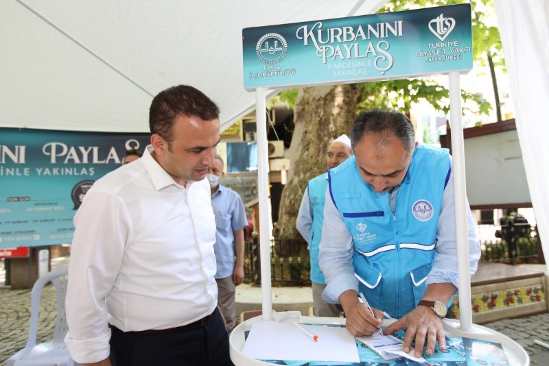 Fatsa Belediye Başkanı İbrahim Etem Kibar İlçe Müftülüğü tarafından Kavlan Ağacı yanında ‘Kurbanını Paylaş Kardeşinle Yakınlaş’ sloganıyla açtığı vekaletle kurban bağışı standını ziyaret ederek vekaleten kurban bağışında bulundu.