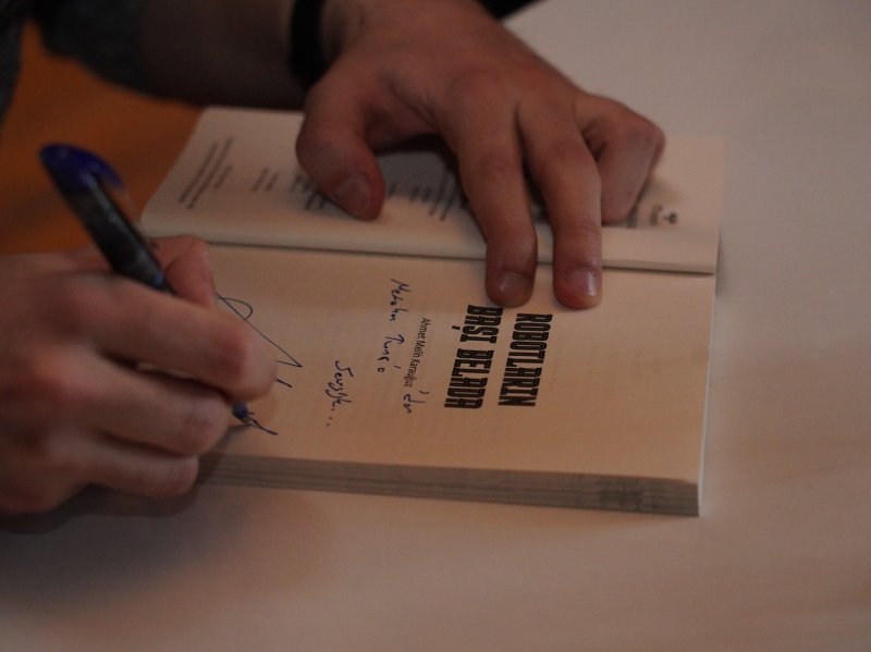 Söyleşi, yazar Ahmet Melih Karauğuz’u kitap imzası ve çiçek takdimi ile son buldu