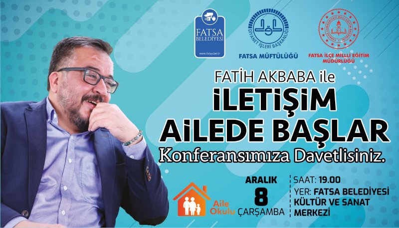 Fatsa Belediye Başkanı İbrahim Etem Kibar’ın davetlisi olarak 8 Kasım Çarşamba günü Fatsa’ya gelecek olan İletişim Uzmanı-Eğitimci Fatih Akbaba ailelere ‘İletişim Ailede Başlar’, gençlere ise ‘Gençlerle Başbaşa’ konulu konferans verecek.
