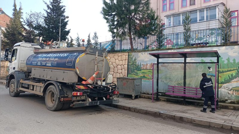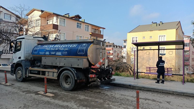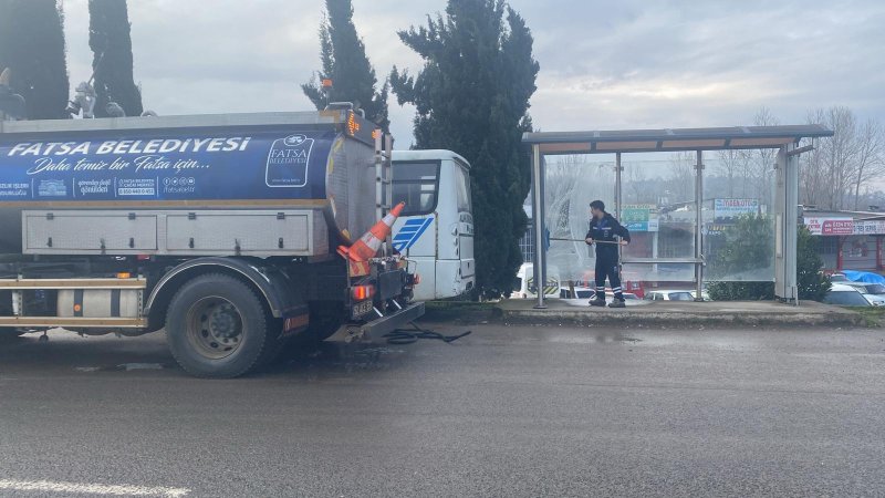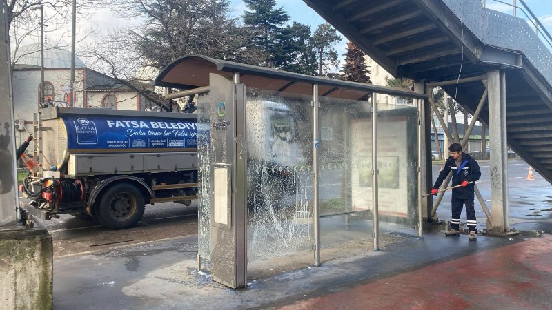 Fatsa Belediyesi Temizlik İşleri Müdürlüğü ekipleri, toplu taşıma araçlarının en yoğun kullanıldığı alanlardan biri olan dolmuş duraklarında hijyen standartlarını en üst seviyeye çıkarmak için titizlikle çalışıyor.