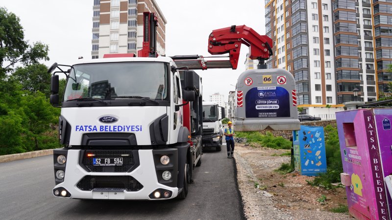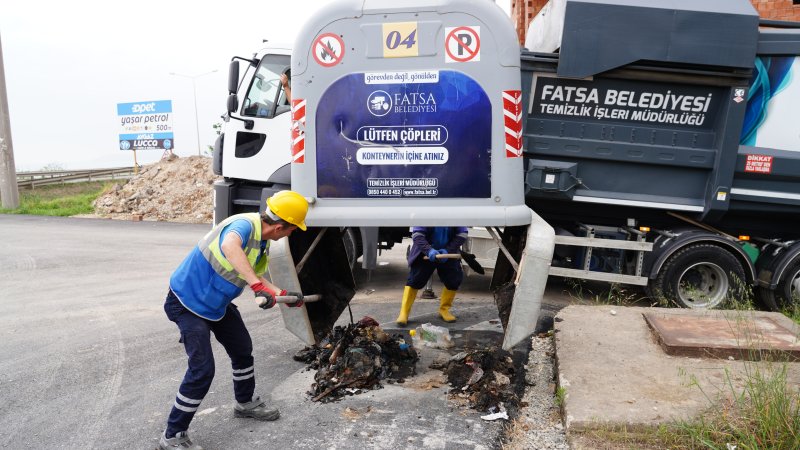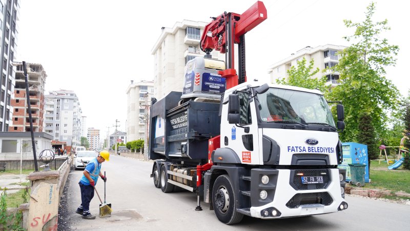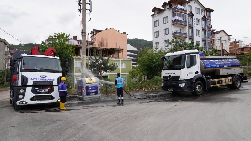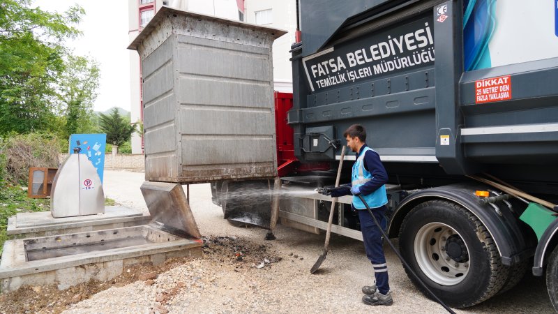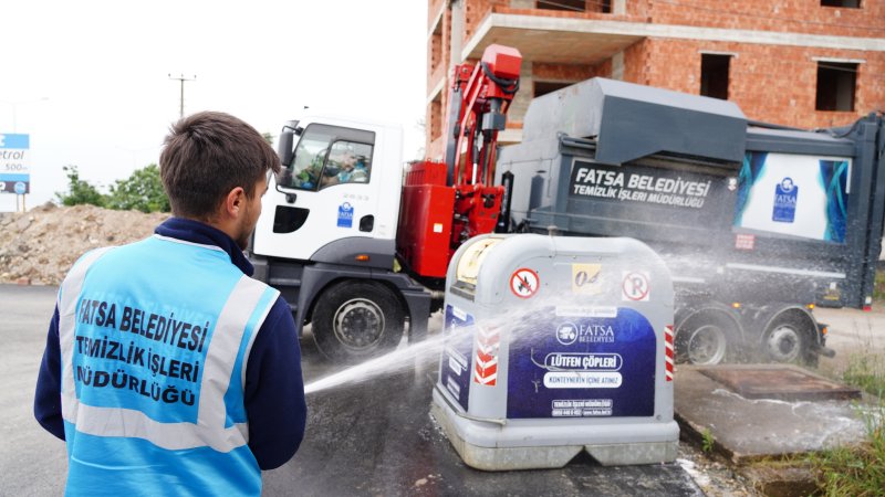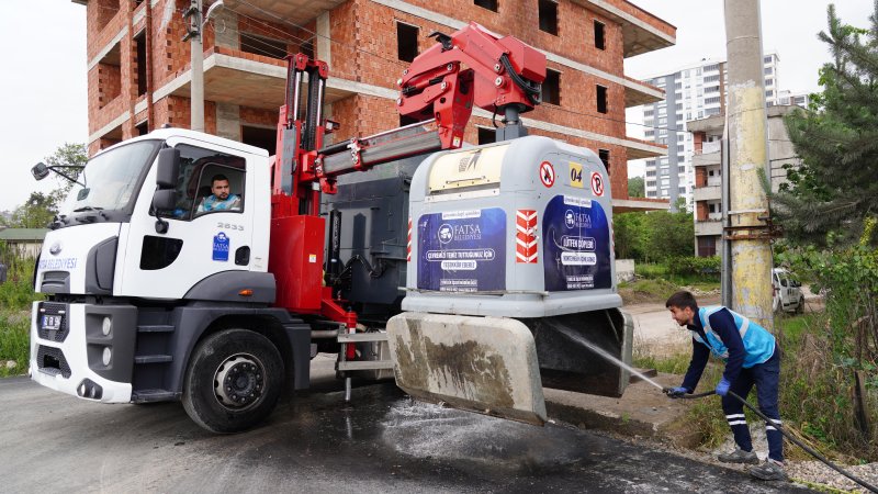 Fatsa Belediyesi Temizlik İşleri Müdürlüğü ekipleri, bulaşıcı hastalıkların önlenmesi, haşere ve uçkun üremesinin engellenmesi, istenmeyen kokuların oluşmaması için ilçe genelinde bulunan yeraltı ve yerüstü konteynerlerini düzenli olarak temizliyor.