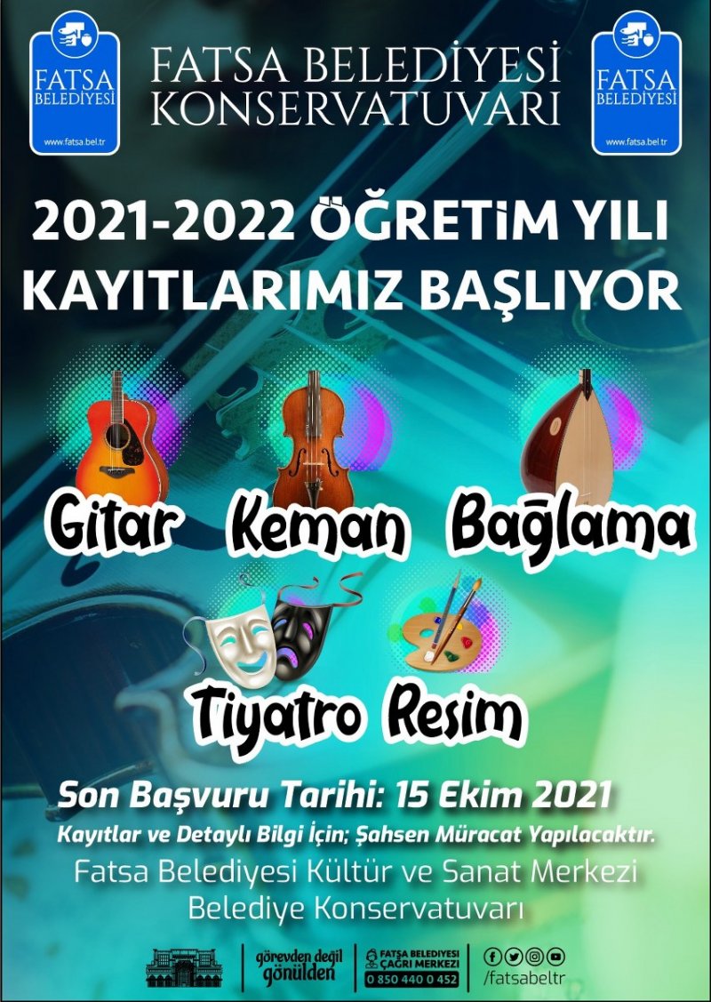 Gitar, Keman, Bağlama, tiyatro ve resim kurslarına kayıt yaptırmak isteyenlerin Fatsa Belediyesi Kültür ve Sanat Merkezi’nde bulunan Belediye Konservatuvarına şahsen başvuru yapması gerektiği ve son başvuru tarihinin 15 Ekim 2021 olduğu belirtildi.