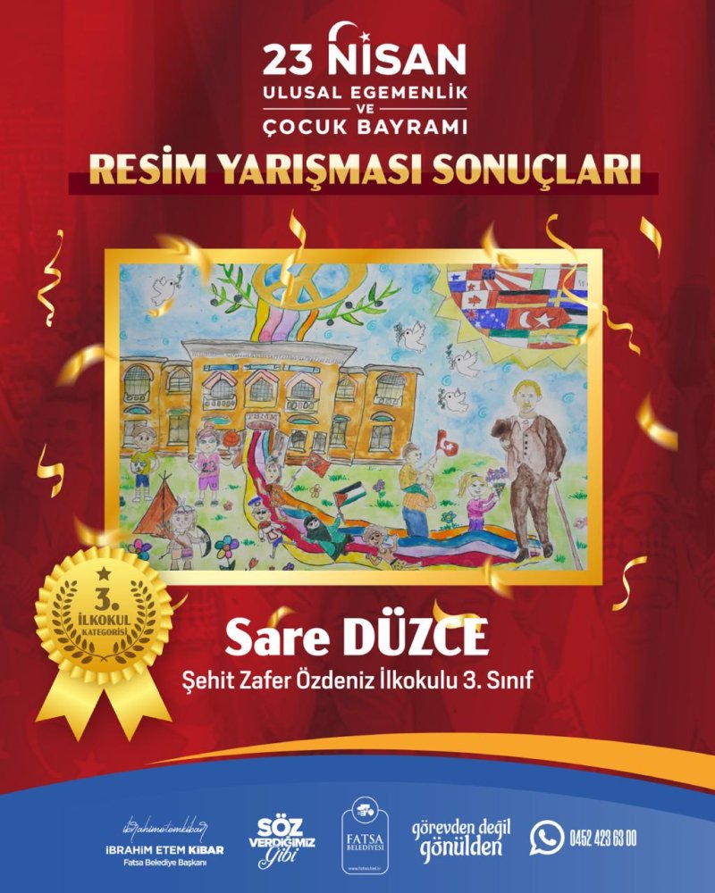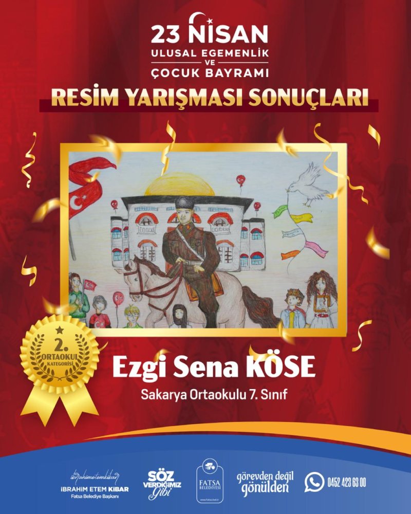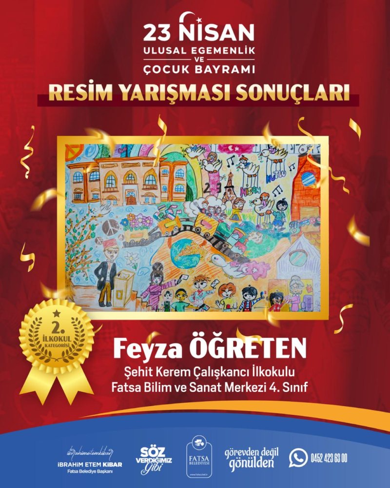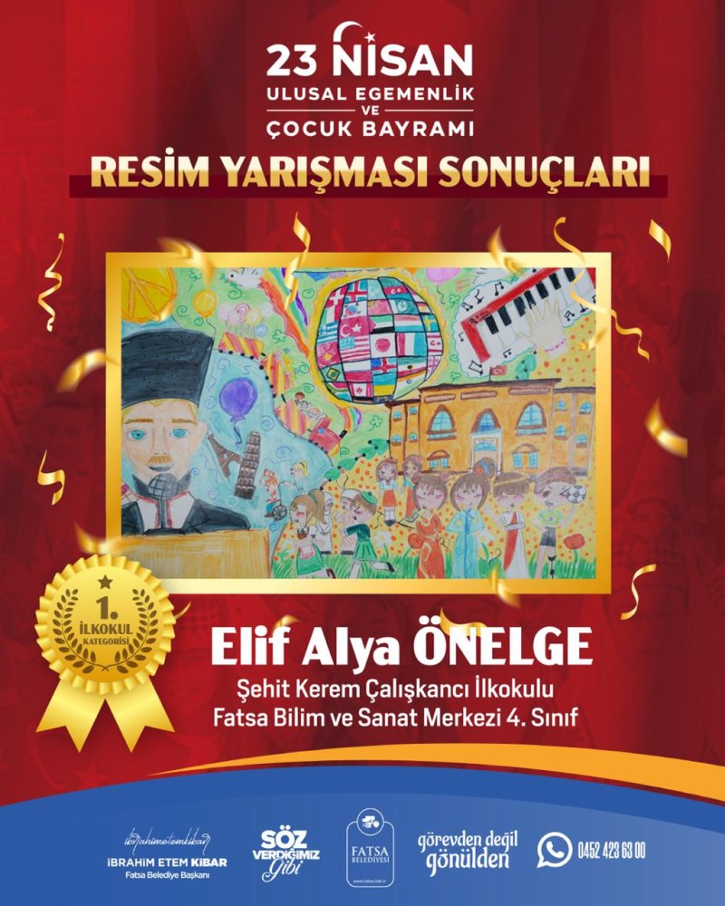 Fatsa Belediyesi tarafından geleneksel hale getirilen ve bu yıl yedincisi düzenlenen “23 Nisan Ulusal Egemenlik ve Çocuk Bayramı” konulu ödüllü resim yarışması sonuçlandı. Büyük ilgi gören yarışmada, öğrencilerin birbirinden renkli ve anlamlı eserleri jüri tarafından değerlendirilerek dereceye giren isimler belirlendi.
