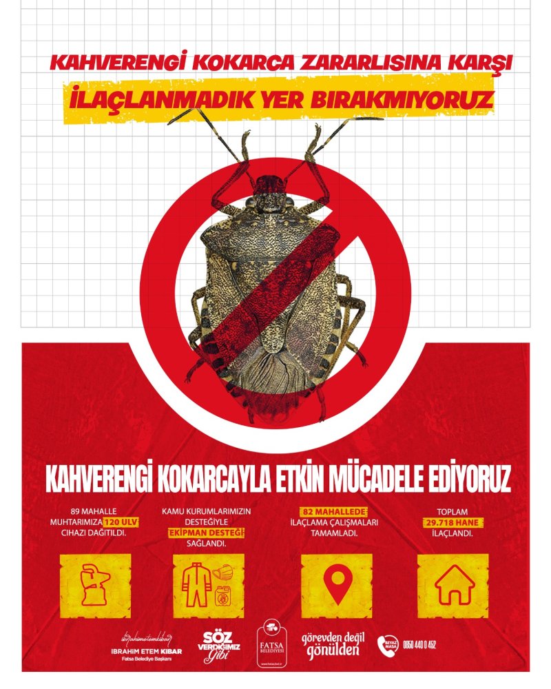 Fatsa’da tarımsal üretimi tehdit eden kahverengi kokarca zararlısına karşı yürütülen mücadele, ilçe genelinde kararlılıkla devam ediyor. Kaymakamlık, Belediye, Tarım Müdürlüğü, Ziraat Odası ve mahalle muhtarlarının iş birliğiyle başlatılan çalışmalarda önemli bir mesafe kat edildi.