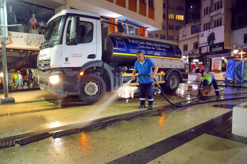 Fatsa’da kurulan pazarlar gün sonunda detaylı bir temizlik sürecinden geçiriliyor. Ekipler, alanın süpürülmesi, köpüklü suyla yıkanması ve oluşan atıkların bertarafı gibi işlemleri titizlikle yerine getiriyor.