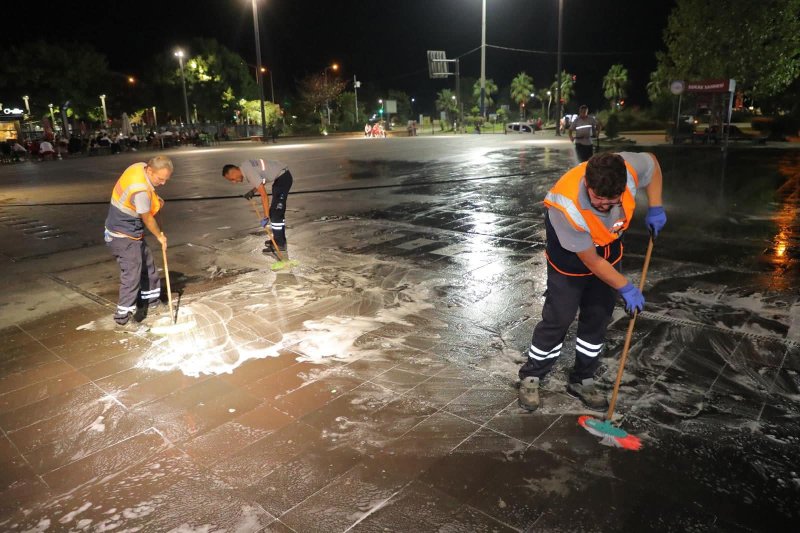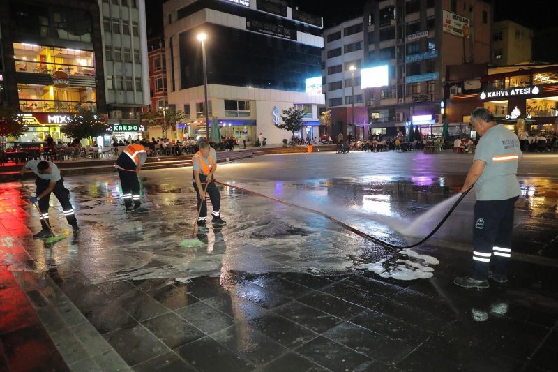 Dün gece yapılan çalışmalarda, trafiğe kapalı caddeler ve Cumhuriyet Meydanı köpüklü suyla yıkanarak baştan sona temizlendi. Ayrıca yağmur suyu mazgallarına gelişigüzel atılan çöpler ekipler tarafından toplanarak olası tıkanmaların önüne geçildi. Temizlik İşleri Müdürü Erdem Yuva, çalışmalara ilişkin yaptığı açıklamada şu ifadeleri kullandı: