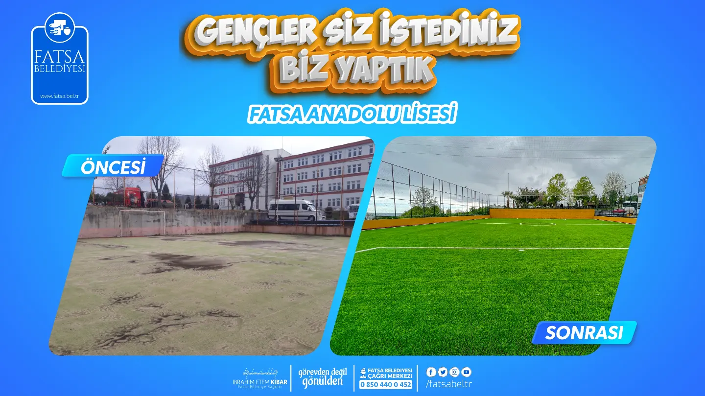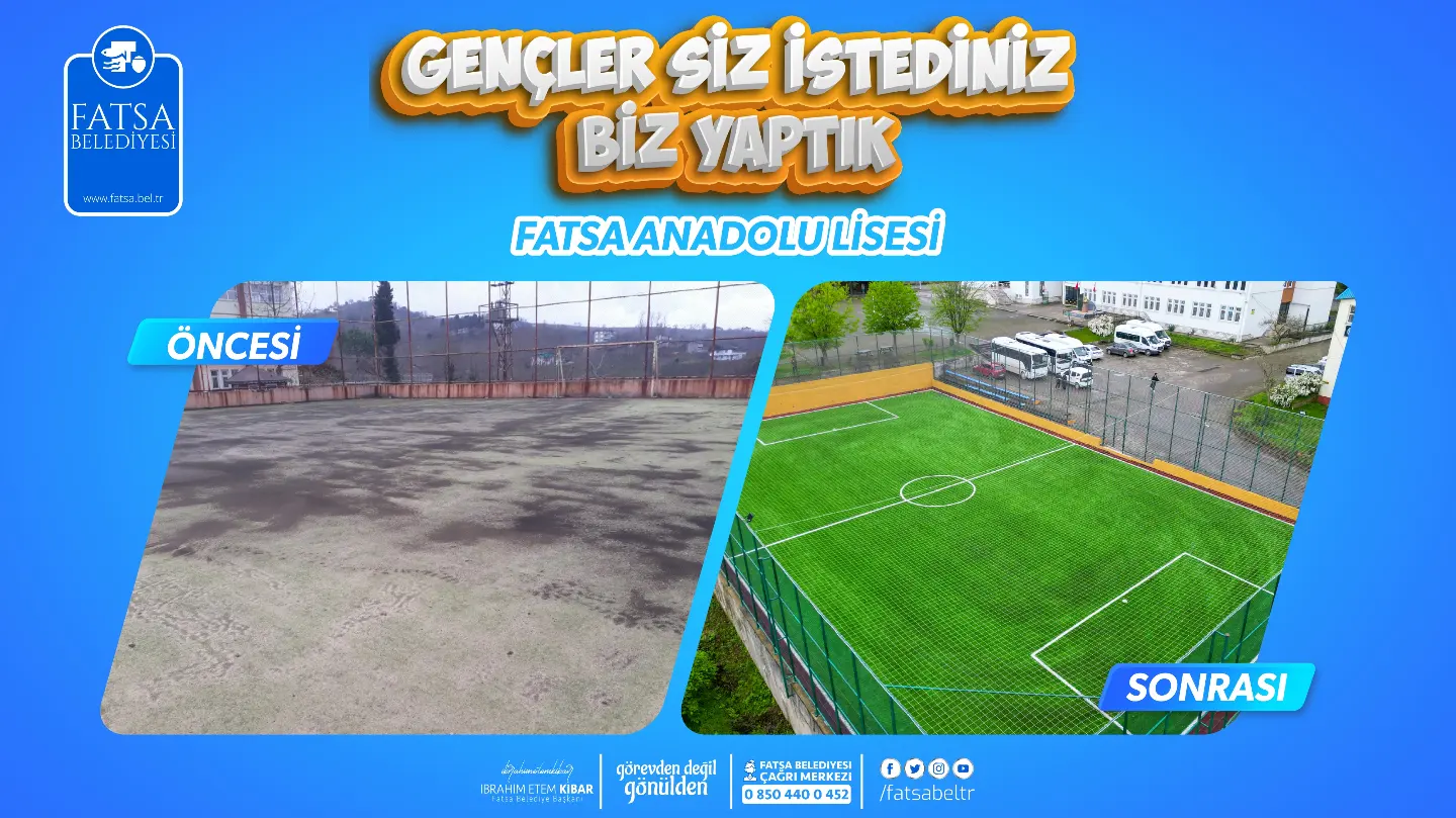 Belediye Başkanı İbrahim Etem Kibar’ın, Fatsa Anadolu Lisesi’nde gerçekleşen bir konferansta, gençlere söz verdiği halı sahanın yapımı tamamlandı. Konuyla ilgili bir açıklama yapan Belediye Başkanı İbrahim Etem Kibar okul ziyaretlerinde öğrencilerden spor sahaları konusunda yoğun talepler aldıklarını belirterek, “Biz zaten Fatsa Belediyesi olarak spor yatırımlarına büyük önem veriyoruz Gençlik ve Spor bakanımızla yaptığımız görüşmeler sonucunda ilçemize spor sahaları kazandırmaya devam ediyoruz. Fatsa Anadolu Lisesi halı sahası programımızda olmamasına rağmen gençlerin yoğun talebi üzerine Halı sahayı programımıza aldık ve yapımını tamamladık gençlerimize hayırlı olsun. Şunu da özellikle belirtmek isterim ki yeni yapılan halı sahanın açılışını gençlerle birlikte maç yaparak gerçekleştirmek isterim. Kendine güvenen gençlerden maç teklifini bekliyorum.” dedi.