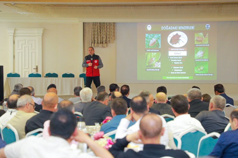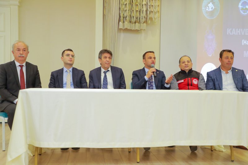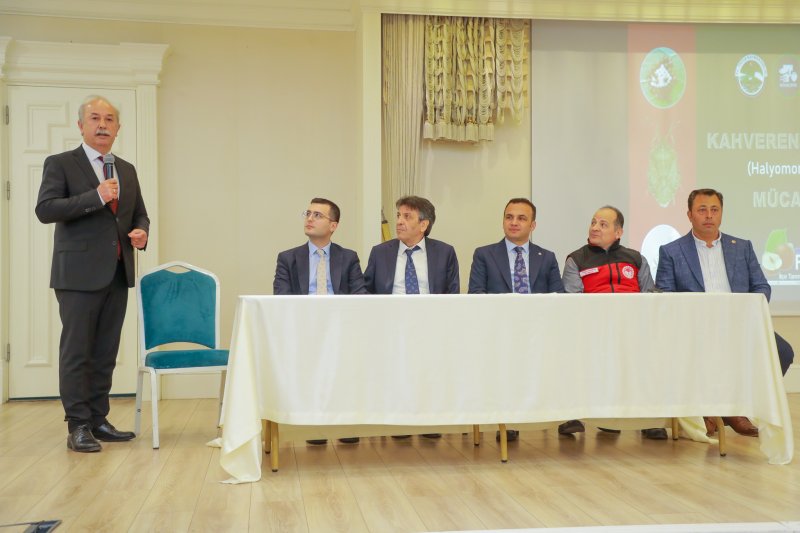 Kaymakam Avni Kula ve Belediye Başkanı İbrahim Etem Kibar’ın konuşmalarının ardından İlçe Tarım Müdürü Vedat Aydoğan ve Ziraat Odası Başkanı Haydar Gürsu Kahverengi Kokarca ile mücadele konusunda bilgilendirme yaptı.