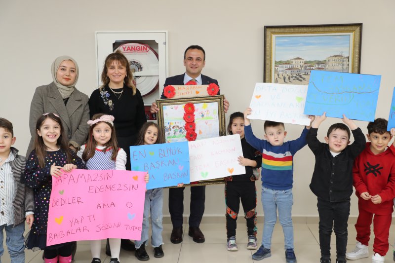 Minikler ellerindeki pankartlarla da Belediye Başkanı İbrahim Etem Kibar’ı çok şaşırttılar. Çocukların pankartında;