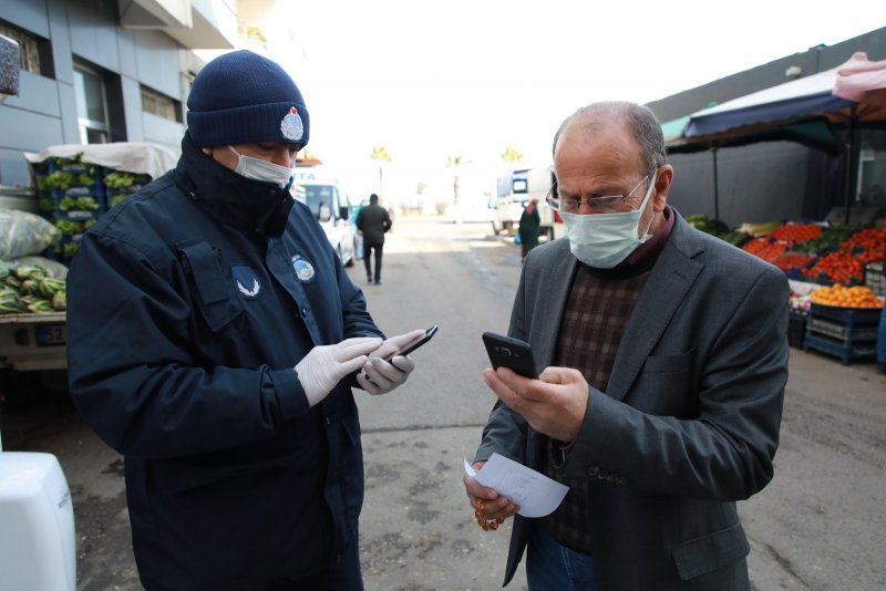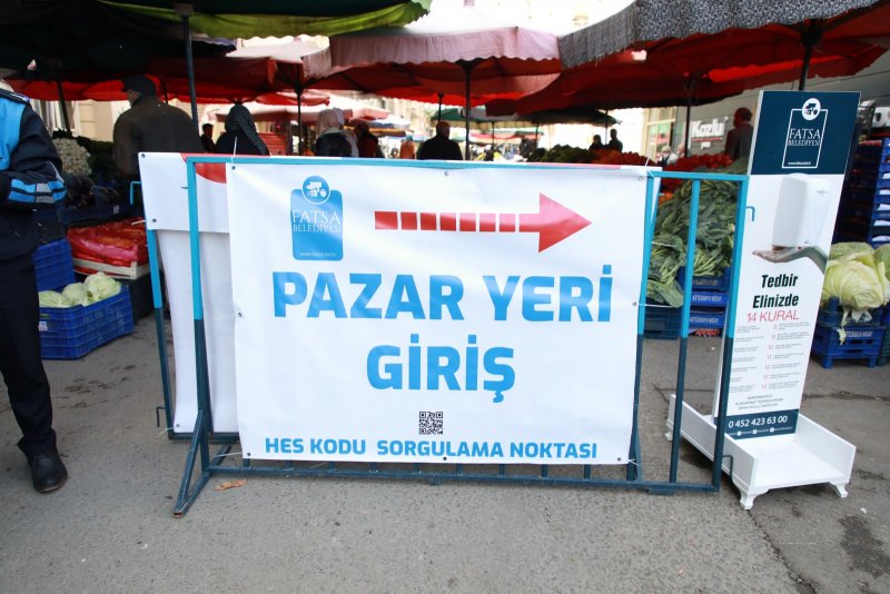 Semt pazarlarında koronavirüs (Covid-19) tedbirleri kapsamında denetim yapan Fatsa Belediyesi Zabıta Ekipleri, Hayat Eve Sığar (HES) uygulamasında kod sorgulaması yaptıktan sonra vatandaşların pazar yerlerine girişlerine izin veriyor.