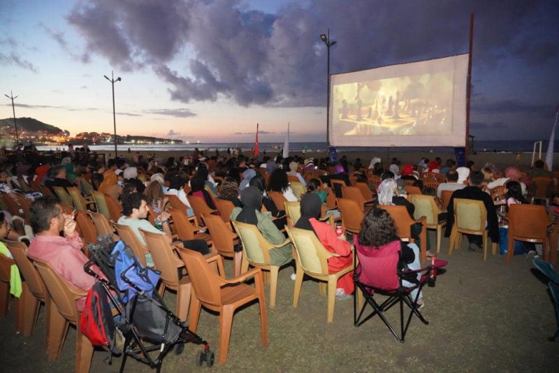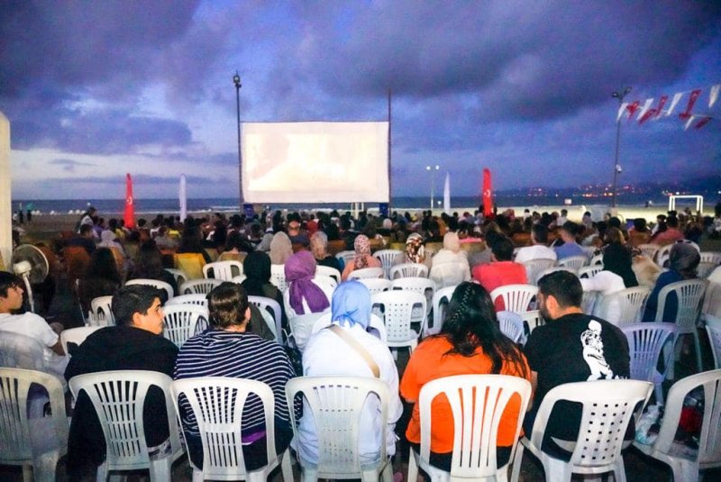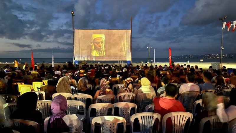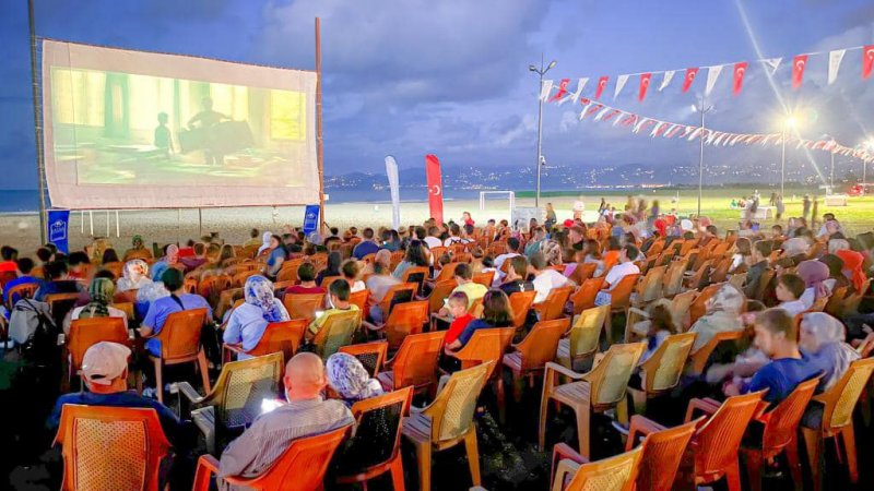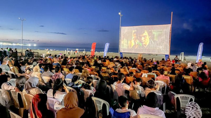 Fatsalı vatandaşlar denizden gelen ılık rüzgar eşliğinde Uzunkum Plajında yıldızların altında sinema keyfini sürüyor.