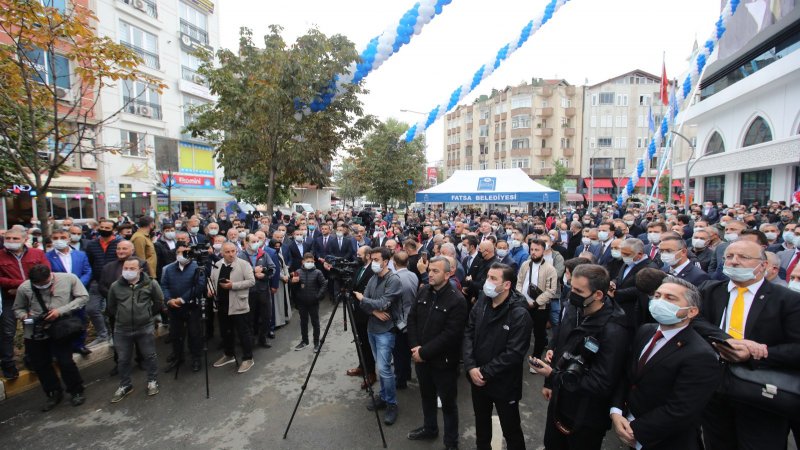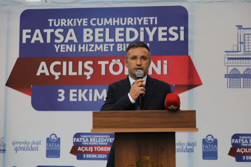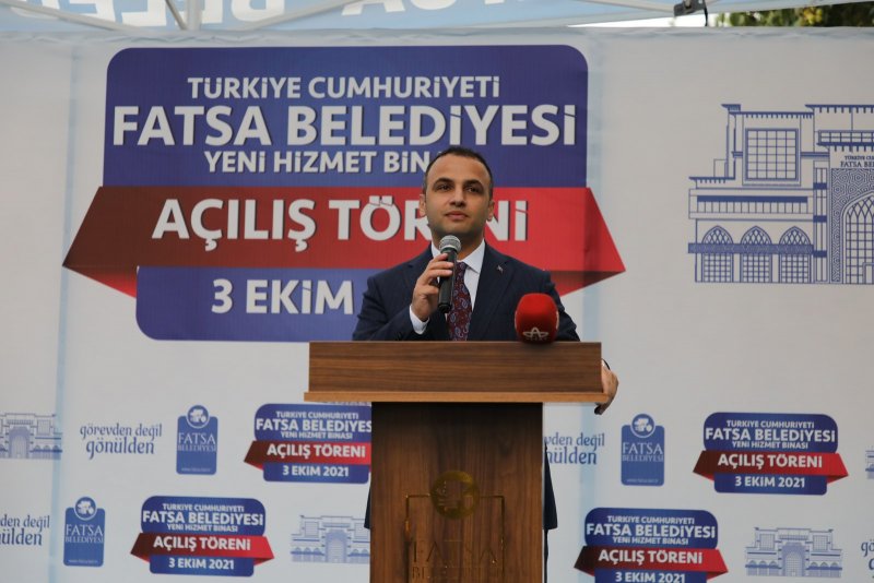 Fatsa Belediye Başkanı İbrahim Etem Kibar ise konuşmasında, “Fatsa’da yaşayan herkesin evi olan geleneksel mimarimizi yansıtan, çevreye duyarlı teknik özellikleriyle, Fatsa’ya ve Fatsalıya daha kaliteli hizmet sunmamıza vesile olan, Yeni Belediye hizmet binamızın açılışına hoş geldiniz, sefalar getirdiniz. Milletimizin Allah devletimize zeval vermesin duasının gerisindeki en önemli vesileden biri de ihtiyaç duyduğunda kendisine sahip çıkacak bu tür kurumlara olan güvenidir, itimadıdır. Bu güvene ve itimada sahip olan Güçlü Devletimizin kurumlarından biri olan Belediyeler, Halkın her sorununda müracaat ettiği, sorununa çözüm aradığı, nice umudun – nice duanın kapısıdır. İnsanlığın hayrına ve milletimizin geleceğine adanmış ömrü ile halkımızın müşterek değerlerine duyduğu saygı, Dünyadaki tüm mazlum insanların umudu olan Sayın Cumhurbaşkanımız Recep Tayyip Erdoğan önderliğinde ve liderliğinde; Sayın Genel Başkan Vekilimiz, Sayın Valimiz, Sayın Büyükşehir Belediye Başkanımız, Milletvekillerimiz, Ak Parti İl Başkanımız, İlçe başkanımız ve hemşehrilerimiz ile oluşturduğumuz birlik – beraberlik ve uyum sayesinde çok daha güçlü bir Türkiye, Ordu ve Fatsa oluşturacağız. Ben, Fatsa Belediye Başkanı olarak, dahası bir Fatsalı kardeşiniz olarak; Fatsa’mıza hizmet etmiş, taş üstüne taş koymuş herkese samimi duygularımla şükranlarımı sunuyor, teşekkür ediyorum. Fatsa Belediyemiz görkemli bir binaya kavuştu. Ancak binanın görkemi ve ihtişamı tek başına bir şey ifade etmiyor. Aslolan, Fatsa’mızı gelecek vizyonuna hazırlayarak hak ettiği gelişmişlik seviyesine ulaştırmaktır. Bizim canla başla 24 saat esaslı çalışmaktaki gayemiz tam da budur. Aslolan, halkımıza hizmet etmek, adalet ve hak’kı savunmak, yoksula, yetime ve muhtaca el uzatıp gönül kapılarını aralamak ve hayır dualarını almaktır. Yeni hizmet binamızın bizlerden sonra da görev yapacak Fatsa sevdalısı arkadaşlarımıza, Fatsa’mıza ve halkımıza hayırlı uğurlu olmasını diliyor, açılışmızı onurlandıran kıymetli büyüklerimize ve misafirlerimize şükranlarımı sunuyorum.” diye konuştu.